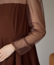 お袖と胸元にはドットチュール、ボディ部分には上品な合繊生地を使用。